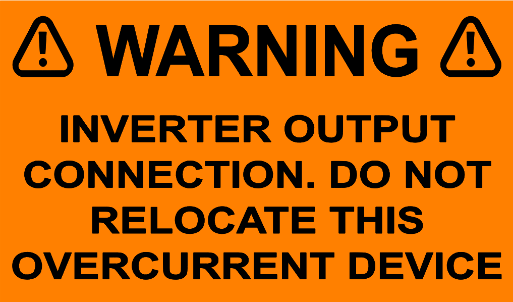 L – 0181, Warning, Inverter Output Connection, Do not relocate, Orange w/Black, Plastic, Double sided adhesive to withstand hottest and coldest temperatures.